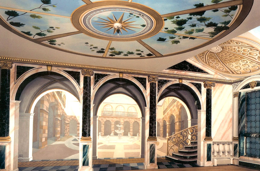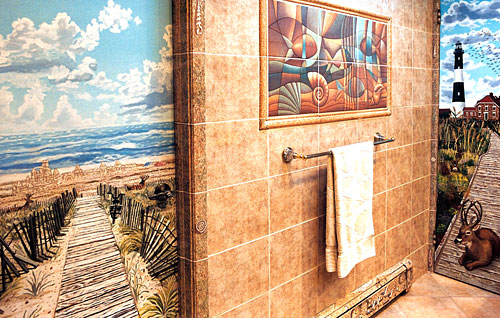 Often, an effective use of a mural is to create an opening in the painted surface itself like an arch, a window, french doors or the jagged edges of masonry. Illusionary spaces can be created beyond the wall by means of a landscape scene, which is painted to be seen through these illusionary architectural opening. They can transport you to marvelous exotic lands or your dream vacation. This works as effectively as the more costly renovation of breaking through walls and ceilings, which in many cases is simply not possible. Murals are an excellent design solution in highly humid areas such as bathrooms where wallpaper does not adhere well for a long period of time.